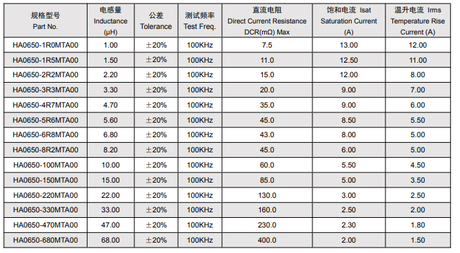 - 饱和电流:指电感量下降 30% 的临界电流,例如 10.0μH 型号(HA0650-100MTA00)的 Isat 为 5.5A,确保电感在脉冲大电流下仍能维持有效储能;