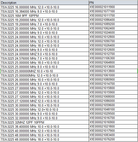 今天给大家介绍适用于便携式无线传输设备的3225无源那么就不得不提下TSX-3225ESPON的TSX-3225产品已经非常成熟,已经在各个产品各种应用环境中都有成熟的应用,业内人都知道,虽然爱普生已经开发出2520甚至更小尺寸2016无源晶振,但是尺寸更小,也代表着制造工艺越发繁琐成本的增高,现在很多便携式产品需要尺寸小,高性能,寿命长,价格适中的,3225已经相对而言属于小尺寸晶振,可以满足便携式设备的要求,价格也比2520,2016要低,厉害的是,TSX-3225无源晶振的成本比5032的也低,所以说TSX-3225是性价比较高的的选择。TSX-3225常用的型号中TSX-3225 24MHz 12PF±10PPMTSX-3225 16MHz 12PF 10PPM都是比较常用的两颗料工作温度:-40℃ ~ +85℃。TSX-3225系列无源晶振是一款应用比较广泛的爱普生无源晶振。因为其频率范围覆盖16MHz~48MHz。可以用于移动电话,蓝牙,无线-局域网,ISM 频段电台广播,MPU时钟等领域。下面米兰电子就把TSX-3225的常用的标准频率表分享给大家